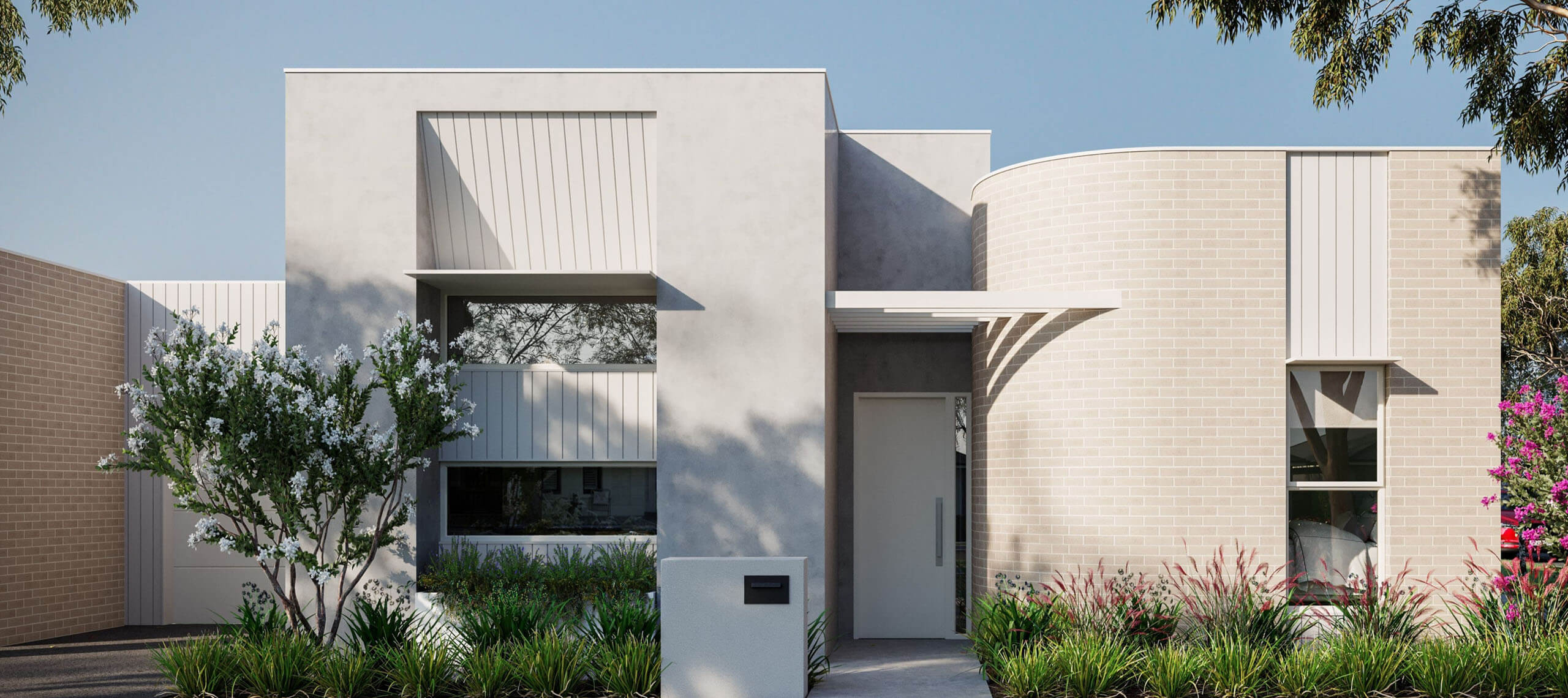 - Bold geometric facade creating interest and identity