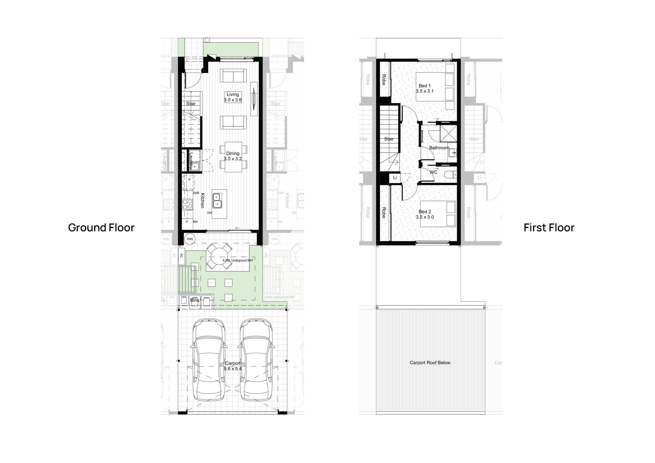 preparing meals & entertaining friends. A separate WC adds practical convenience, while the alfresco area creates a seamless connection to the outdoors. With an underground 5,000L rainwater tank, the Myrtle combines sustainable living with style and comfort.
